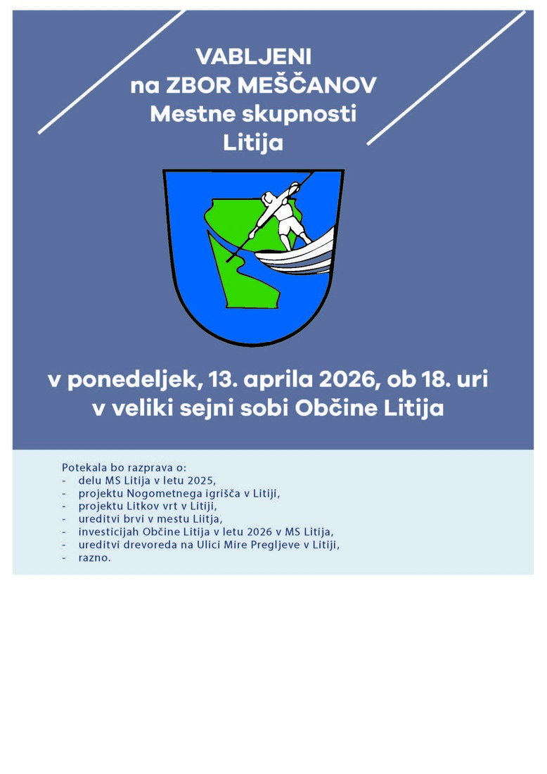 Vabljeni na zbor meščanov Mestne skupnosti Litija, ki bo v ponedeljek, 13. aprila 2026, ob 18. uri, v veliki sejni sobi Občine Litija.